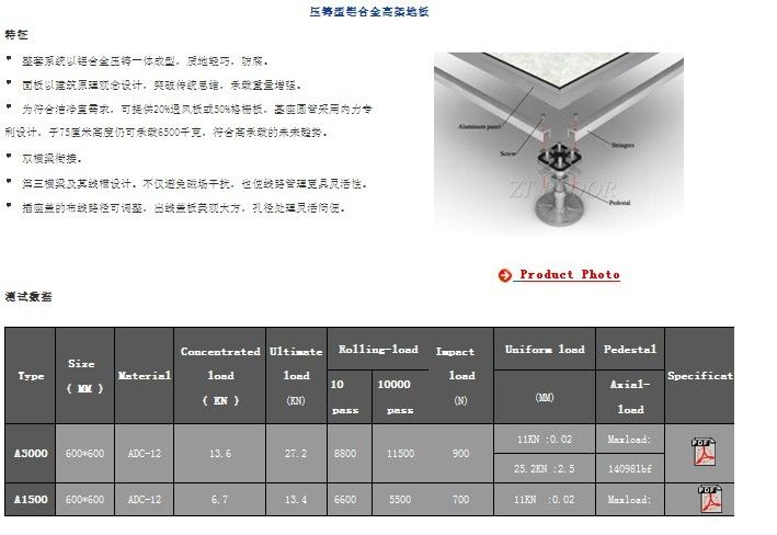 - 性能特点:全钢组成,机械强度高、承载能力强、耐冲击性能好;表面静电喷塑,柔光、耐磨、防水、防火、防尘、防腐蚀;耐磨性及防静电性能优良、抗污染、便于清洗、装饰性强;尺寸精度高、互换性好、组装灵活、使用寿命长。全钢高架地板适用场所:全钢地板适用在载重要求和防静电要求较高的场合,比如有大型服务器和机柜的主机房;大、中、小型的计算机机房,以交换机为代表的通信中心机房、各种电气控制机房、邮电枢纽和用计算机控制的军事、经济、国家安全、航空、航天及交通指挥调度和信息管理中心等环境 。